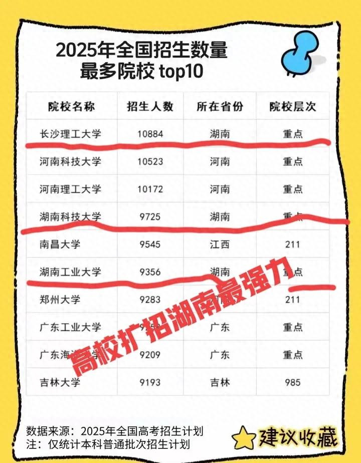 唯独湖南扩招幅度最大,不是一般地大,硬生生把三所不见经传的双非高校的本科招生规模推到全国前十。